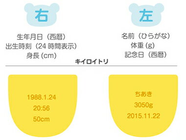 【右足記入例】生年月日(1980.9.3)・出生時刻(15:01)・身長(50.5cm)【左足記入例】名前=かな表記(ゆうすけ)・体重(3,130g)・結婚記念日(2012.11.22)●ご注文後、作成に入ります。