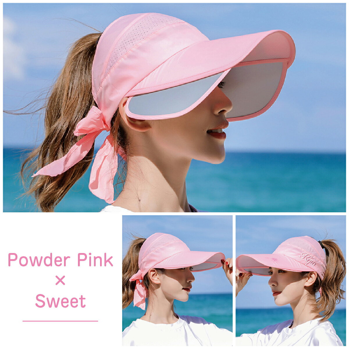 UVカット サンバイザーサイドからの日差しをカットできるサイドウイング付いろいろなスタイルにコーディネートしやすいロゴ刺繍と花びらのワンポイントプリント引き出したり収納したりできる伸縮可能なウイング付サイドからの日差しをカットできるバックはボウで華やかに内側はメッシュになっているので通気性がよく快適です。